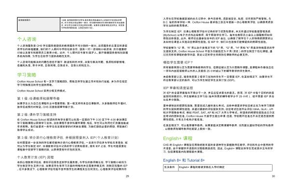 个人咨询服务是 CHS 学生服务部提供的教育服务不可分割的一部分 。 这项服务的主要目标是促 进学生的幸福健康 。 我们的个人顾问与学校社区合作 , 提供一对一咨询和小组咨询 , 开办健康研 讨会以及家长和教职员工教育小组 。 此外 , 个人顾问还与家长 / 监护人 、 医疗保健提供者和社区服 务机构协商 , 为学生在校学习提供战略性支持 。