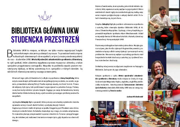 Biblioteka UKW to miejsce, w którym nie tylko można wypożyczać książki i w komfortowym otoczeniu poświęcić się nauce. To przestrzeń wielu imprez kulturalnych skierowanych do wszystkich, w tym( a może przede wszystkim) do nas – studentów UKW. Wrota Wyobraźni: akademickie spotkania z literaturą, to cykl spotkań, które uświetnia wyjątkowa oprawa muzyczna i aktorska, a także specjalnie przygotowana scenografia. Wszystko to podkreśla wysoki poziom merytoryczny dyskusji, w której uczestniczą m. in. specjaliści z różnych dziedzin. Są wśród nich również pracownicy naszego uniwersytetu.