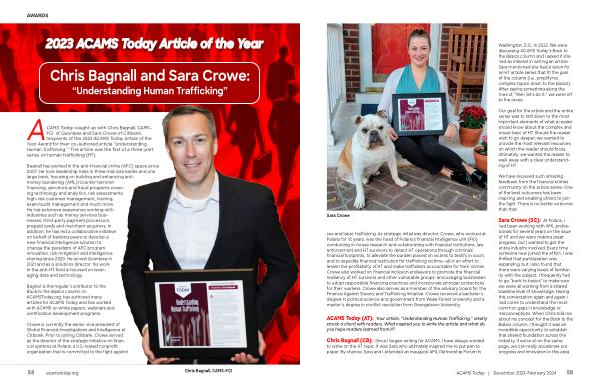ACAMS Today caught up with Chris Bagnall , CAMS- FCI , of Quantexa and Sara Crowe of Citibank , recipients of the 2023 ACAMS Today Article of the Year Award for their co-authored article “ Understanding Human Trafficking .” 1 The article was the first of a three-part series on human trafficking ( HT ).