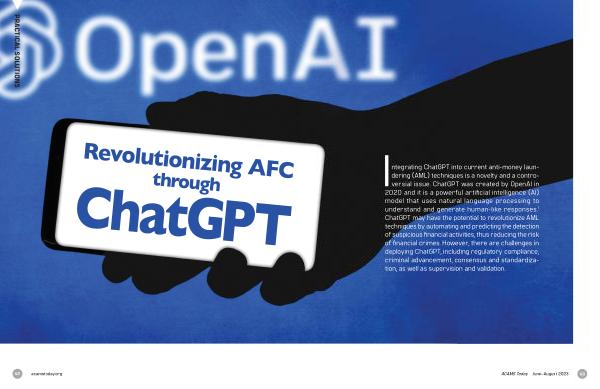 Integrating ChatGPT into current anti-money laundering ( AML ) techniques is a novelty and a controversial issue . ChatGPT was created by OpenAI in 2020 and it is a powerful artificial intelligence ( AI ) model that uses natural language processing to understand and generate human-like responses . 1 ChatGPT may have the potential to revolutionize AML techniques by automating and predicting the detection of suspicious financial activities , thus reducing the risk of financial crimes . However , there are challenges in deploying ChatGPT , including regulatory compliance , criminal advancement , consensus and standardization , as well as supervision and validation .
