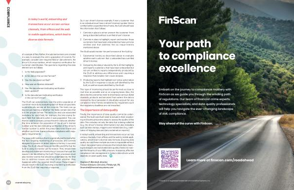 Embark on the journey to compliance mastery with FinScan as we guide you through the winding path of regulations . Our team of financial crime experts , technology specialists , and data quality professionals will help you navigate the ever-changing landscape of AML compliance .