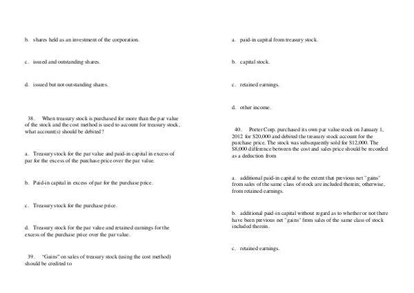 38. When treasury stock is purchased for more than the par value of the stock and the cost method is used to account for treasury stock, what account( s) should be debited?