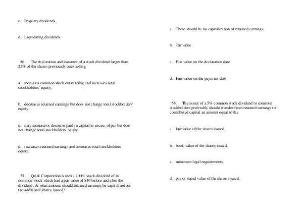 57. Quirk Corporation issued a 100 % stock dividend of its common stock which had a par value of $ 10 before and after the dividend. At what amount should retained earnings be capitalized for the additional shares issued?