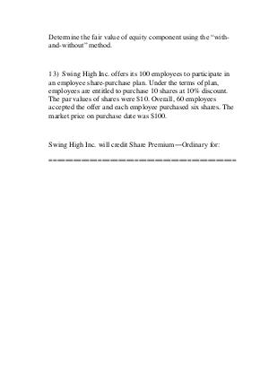 13) Swing High Inc. offers its 100 employees to participate in an employee share-purchase plan. Under the terms of plan, employees are entitled to purchase 10 shares at 10 % discount. The par values of shares were $ 10. Overall, 60 employees accepted the offer and each employee purchased six shares. The market price on purchase date was $ 100.