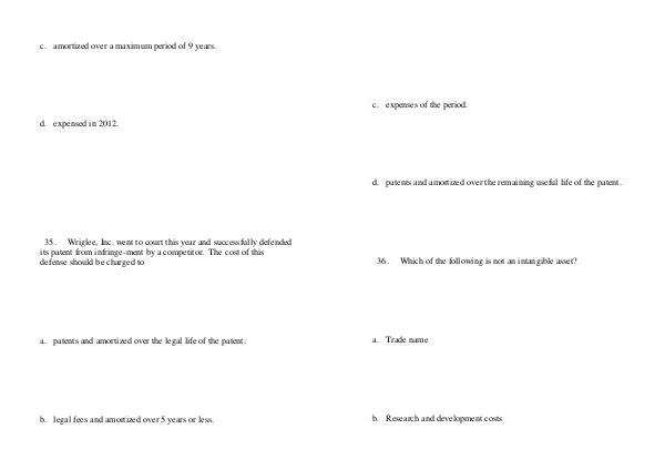 35. Wriglee, Inc. went to court this year and successfully defended its patent from infringe-ment by a competitor. The cost of this defense should be charged to