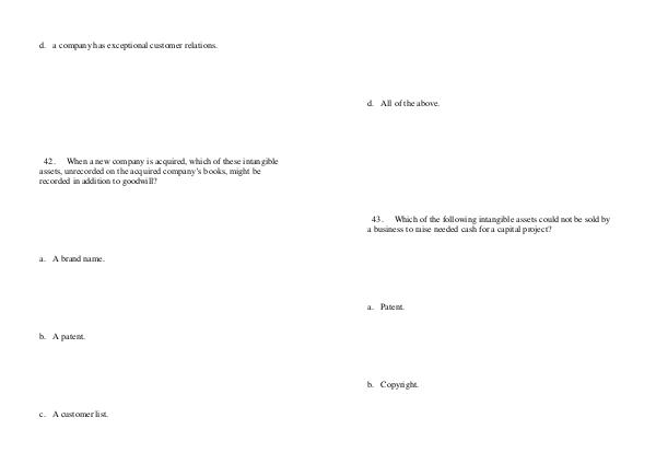 42. When a new company is acquired, which of these intangible assets, unrecorded on the acquired company’ s books, might be recorded in addition to goodwill?