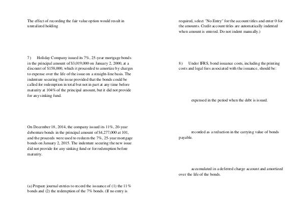 7) Holiday Company issued its 7 %, 25-year mortgage bonds in the principal amount of $ 3,019,000 on January 2, 2000, at a discount of $ 158,000, which it proceeded to amortize by charges to expense over the life of the issue on a straight-line basis. The indenture securing the issue provided that the bonds could be called for redemption in total but not in part at any time before maturity at 104 % of the principal amount, but it did not provide for any sinking fund.