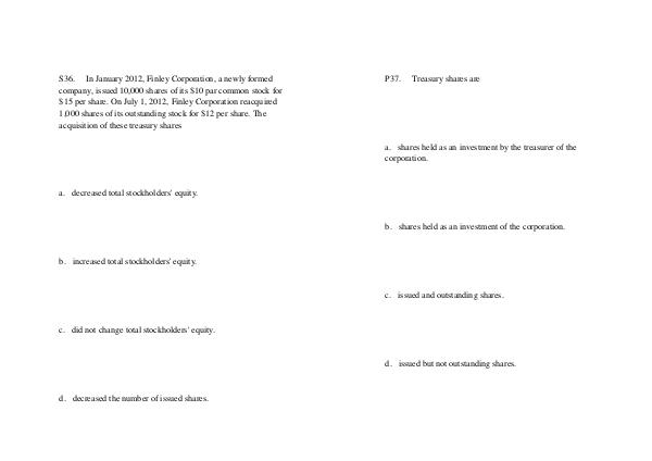 S36. In January 2012, Finley Corporation, a newly formed company, issued 10,000 shares of its $ 10 par common stock for $ 15 per share. On July 1, 2012, Finley Corporation reacquired 1,000 shares of its outstanding stock for $ 12 per share. The acquisition of these treasury shares