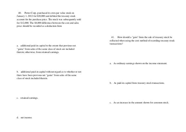 40. Porter Corp. purchased its own par value stock on January 1, 2012 for $ 20,000 and debited the treasury stock account for the purchase price. The stock was subsequently sold for $ 12,000. The $ 8,000 difference between the cost and sales price should be recorded as a deduction from