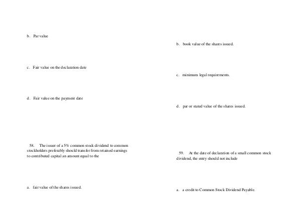 59. At the date of declaration of a small common stock dividend, the entry should not include