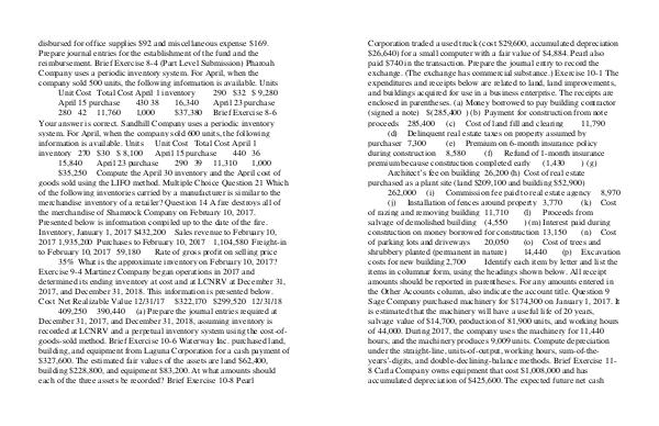 Corporation traded a used truck( cost $ 29,600, accumulated depreciation $ 26,640) for a small computer with a fair value of $ 4,884. Pearl also paid $ 740 in the transaction. Prepare the journal entry to record the exchange.( The exchange has commercial substance.) Exercise 10-1 The expenditures and receipts below are related to land, land improvements, and buildings acquired for use in a business enterprise. The receipts are enclosed in parentheses.( a) Money borrowed to pay building contractor( signed a note) $( 285,400)( b) Payment for construction from note proceeds 285,400( c) Cost of land fill and clearing 11,790( d) Delinquent real estate taxes on property assumed by purchaser 7,300( e) Premium on 6-month insurance policy during construction 8,580( f) Refund of 1-month insurance premium because construction completed early( 1,430)( g) Architect’ s fee on building 26,200( h) Cost of real estate purchased as a plant site( land $ 209,100 and building $ 52,900) 262,000( i) Commission fee paid to real estate agency 8,970( j) Installation of fences around property 3,770( k) Cost of razing and removing building 11,710( l) Proceeds from salvage of demolished building( 4,550)( m) Interest paid during construction on money borrowed for construction 13,150( n) Cost of parking lots and driveways 20,050( o) Cost of trees and shrubbery planted( permanent in nature) 14,440( p) Excavation costs for new building 2,700 Identify each item by letter and list the items in columnar form, using the headings shown below. All receipt amounts should be reported in parentheses. For any amounts entered in the Other Accounts column, also indicate the account title. Question 9 Sage Company purchased machinery for $ 174,300 on January 1, 2017. It is estimated that the machinery will have a useful life of 20 years, salvage value of $ 14,700, production of 81,900 units, and working hours of 44,000. During 2017, the company uses the machinery for 11,440 hours, and the machinery produces 9,009 units. Compute depreciation under the straight-line, units-of-output, working hours, sum-of-theyears’-digits, and double-declining-balance methods. Brief Exercise 11- 8 Carla Company owns equipment that cost $ 1,008,000 and has accumulated depreciation of $ 425,600. The expected future net cash