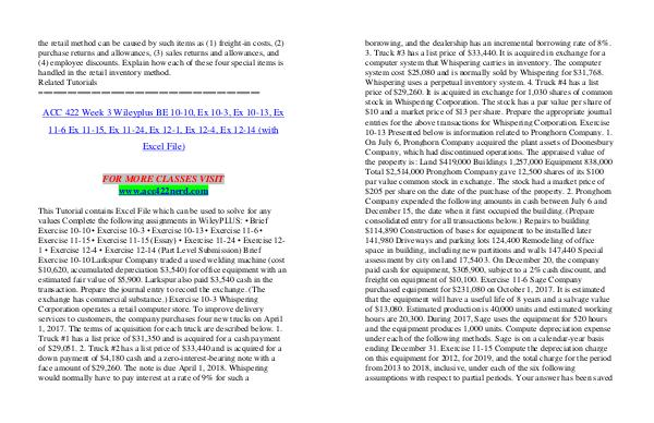 ACC 422 Week 3 Wileyplus BE 10-10, Ex 10-3, Ex 10-13, Ex 11-6 Ex 11-15, Ex 11-24, Ex 12-1, Ex 12-4, Ex 12-14( with Excel File)