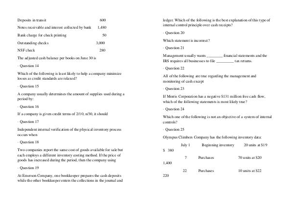 Deposits in transit 600 Notes receivable and interest collected by bank 1,480 Bank charge for check printing 50 Outstanding checks 3,000 NSF check 280 The adjusted cash balance per books on June 30 is