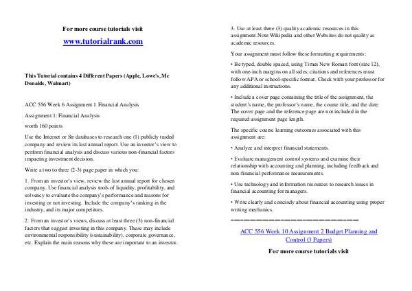 ACC 556 Week 10 Assignment 2 Budget Planning and Control( 3 Papers)