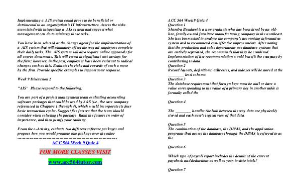 ACC 564 Week 9 Quiz 4 Question 1 Shandra Bundawi is a new graduate who has been hired by an oldline, family-owned furniture manufacturing company in the northeast. She has been asked to analyze the company ' s accounting information system and to recommend cost-effective improvements. After noting that the production and sales departments use database systems that are entirely separated, she recommends that they be combined. Implementation of her recommendation would benefit the company by contributing to data Question 2 Record layouts, definitions, addresses, and indexes will be stored at the ________ level schema. Question 3 The database requirement that foreign keys must be null or have a value corresponding to the value of a primary key in another table is formally called the