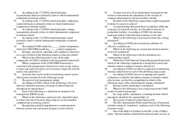 32. The original COSO model has _____ control components, while the COSO ERM model has _____ control components. 33. Strategic, operations, reporting, and compliance objectives are a part of which of the following models of internal control? 34. Which of the following items is one of the eight components of COSO ' s enterprise risk management framework?