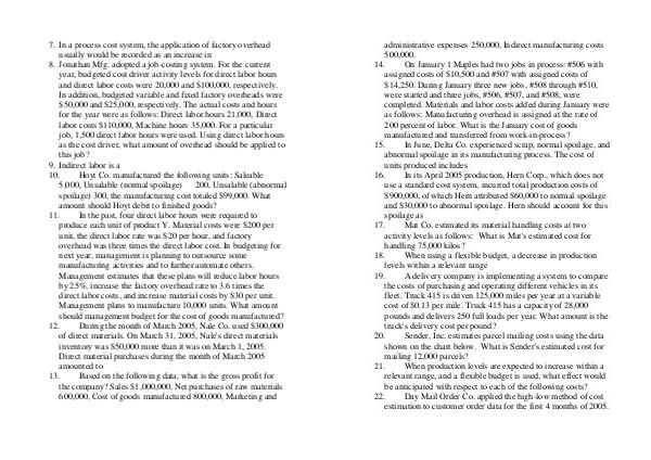 8. Jonathan Mfg. adopted a job-costing system. For the current year, budgeted cost driver activity levels for direct labor hours and direct labor costs were 20,000 and $ 100,000, respectively. In addition, budgeted variable and fixed factory overheads were $ 50,000 and $ 25,000, respectively. The actual costs and hours for the year were as follows: Direct labor hours 21,000, Direct labor costs $ 110,000, Machine hours 35,000. For a particular job, 1,500 direct labor hours were used. Using direct labor hours as the cost driver, what amount of overhead should be applied to this job? 9. Indirect labor is a 10. Hoyt Co. manufactured the following units: Saleable 5,000, Unsalable( normal spoilage) 200, Unsalable( abnormal spoilage) 300, the manufacturing cost totaled $ 99,000. What amount should Hoyt debit to finished goods?