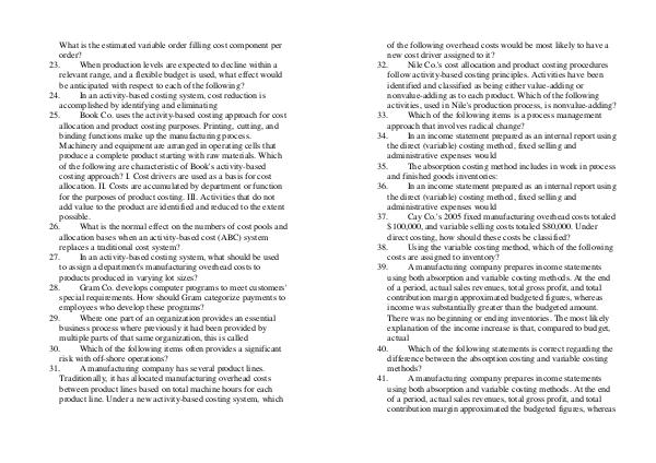 25. Book Co. uses the activity-based costing approach for cost allocation and product costing purposes. Printing, cutting, and binding functions make up the manufacturing process. Machinery and equipment are arranged in operating cells that produce a complete product starting with raw materials. Which of the following are characteristic of Book ' s activity-based costing approach? I. Cost drivers are used as a basis for cost allocation. II. Costs are accumulated by department or function for the purposes of product costing. III. Activities that do not add value to the product are identified and reduced to the extent possible.