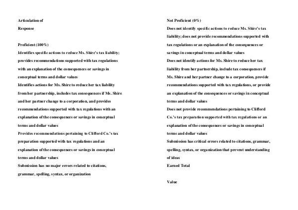 Not Proficient( 0 %) Does not identify specific actions to reduce Ms. Shire’ s tax liability; does not provide recommendations supported with tax regulations or an explanation of the consequences or savings in conceptual terms and dollar values Does not identify actions for Ms. Shire to reduce her tax liability from her partnership, include tax consequences if Ms. Shire and her partner change to a corporation, provide recommendations supported with tax regulations, or provide an explanation of the consequences or savings in conceptual terms and dollar values Does not provide recommendations pertaining to Clifford Co.’ s tax preparation supported with tax regulations or an explanation of the consequences or savings in conceptual terms and dollar values Submission has critical errors related to citations, grammar, spelling, syntax, or organization that prevent understanding of ideas Earned Total