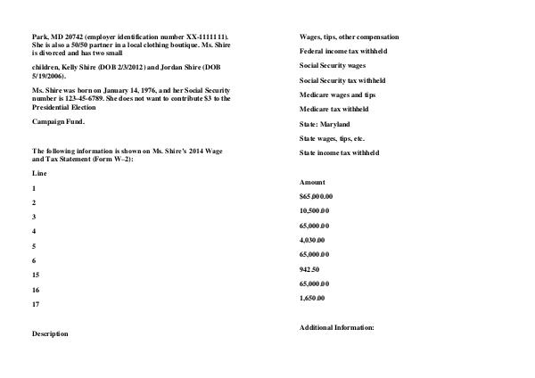 The following information is shown on Ms. Shire’ s 2014 Wage and Tax Statement( Form W – 2):