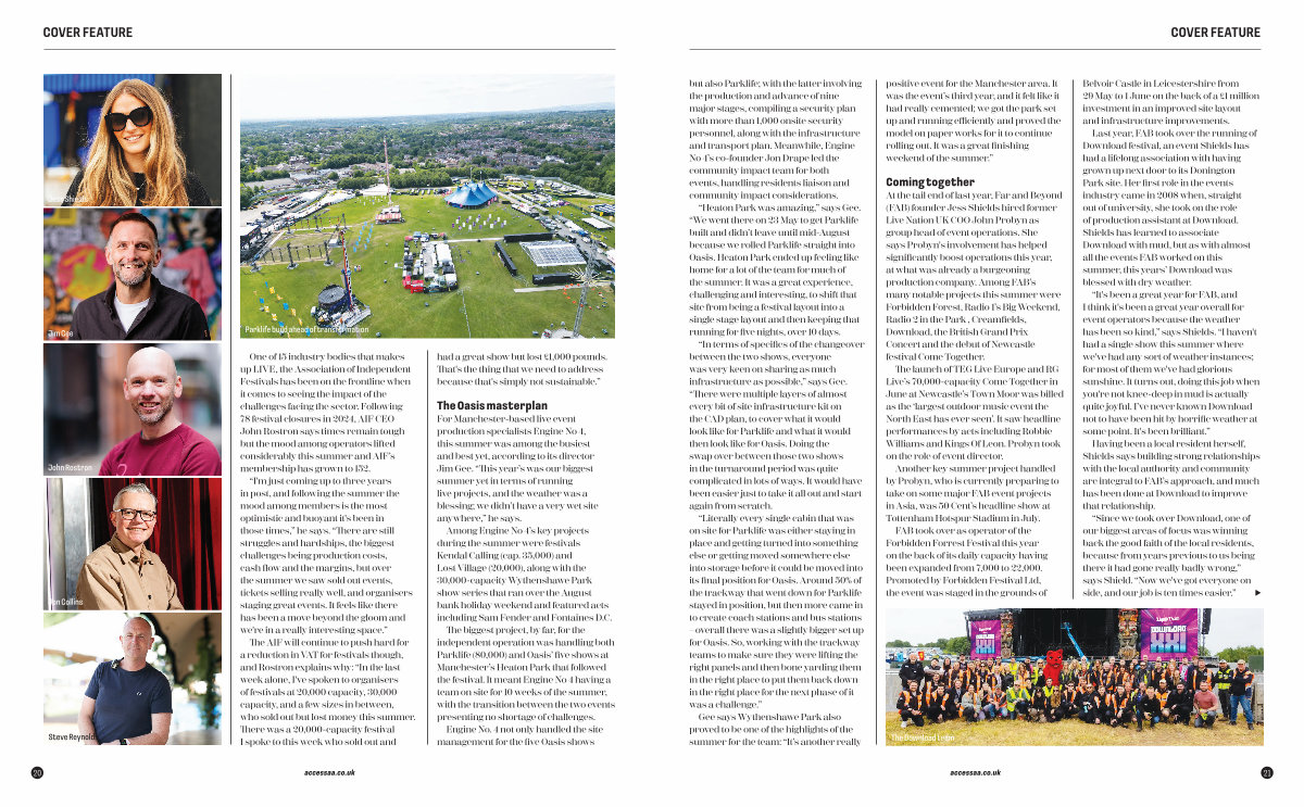 The biggest project, by far, for the independent operation was handling both Parklife( 80,000) and Oasis’ five shows at Manchester’ s Heaton Park that followed the festival. It meant Engine No 4 having a team on site for 10 weeks of the summer, with the transition between the two events presenting no shortage of challenges.