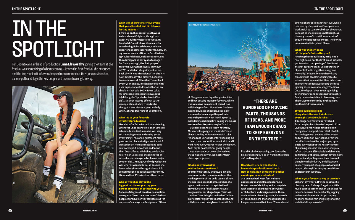 of. She gave me early paid opportunities and kept putting my name forward, which was a massive compliment when I was still finding my feet. Since then, I’ ve been inspired by loads of people, especially women who’ ve managed to push into leadership roles in what is still a pretty male dominated industry. Seeing them do it made me feel like, okay, maybe I can too. I’ ve also been really lucky, not many 29-year-olds get given the kind of trust I have. Landing at Boomtown with Luke Mitchell and Chris Rutherford backing me to lead their production meant a lot, and I work hard every year to not let them down. And I try to pass that on, giving people the same chance to prove themselves that I was once given, no matter their class, age or gender.