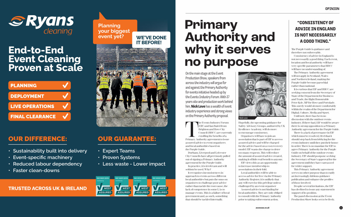On the main stage at the Event Production Show, speakers from across the industry will argue for and against the Primary Authority for events initiative headed up by the Events Industry Forum. With 37 years site and production work behind him, Nick Love has a wealth of event industry experience and strong views on the Primary Authority proposal.