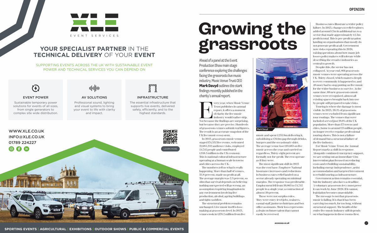 Ahead of a panel at the Event Production Show main stage conference exploring the challenges facing the grassroots live music industry, Music Venue Trust CEO Mark Davyd outlines the stark findings recently published in the charity’ s annual report.
