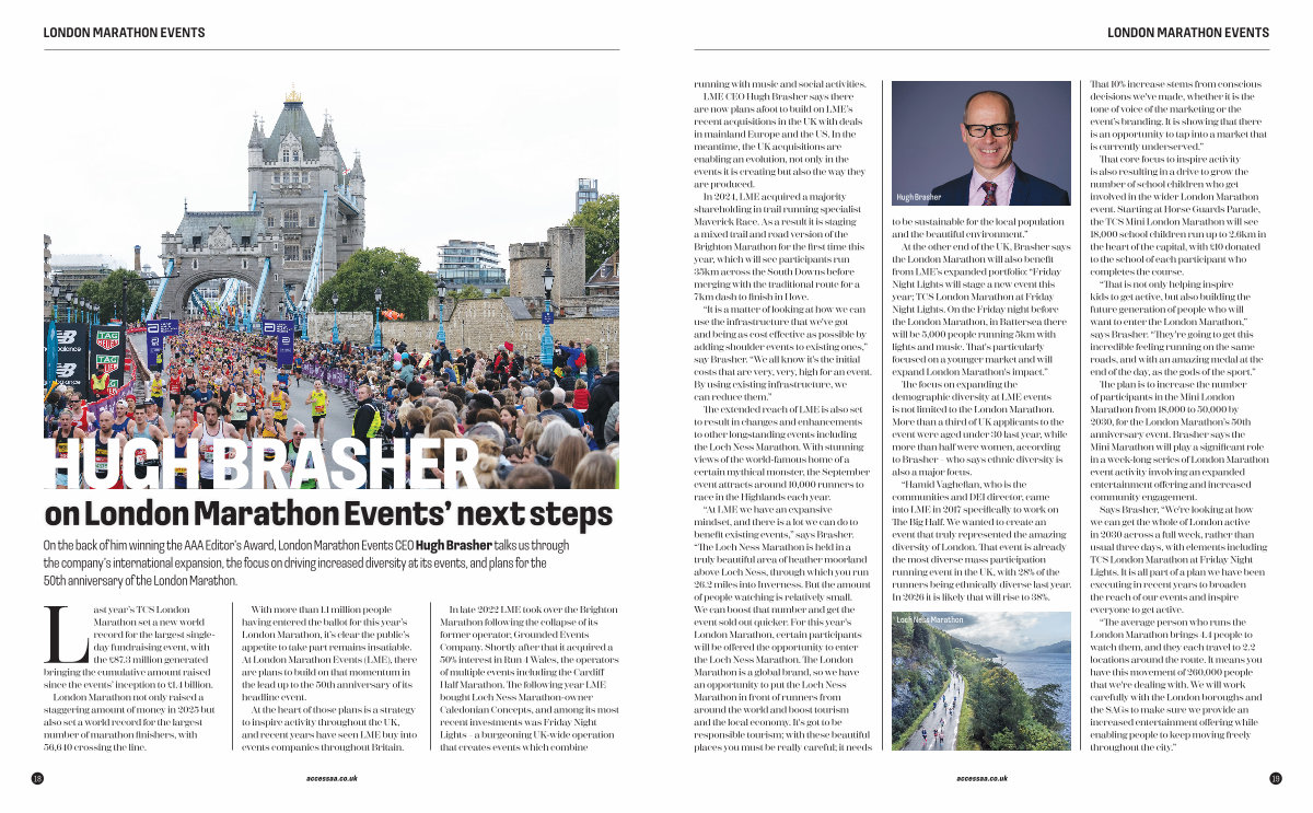 On the back of him winning the AAA Editor’ s Award, London Marathon Events CEO Hugh Brasher talks us through the company’ s international expansion, the focus on driving increased diversity at its events, and plans for the 50th anniversary of the London Marathon.
