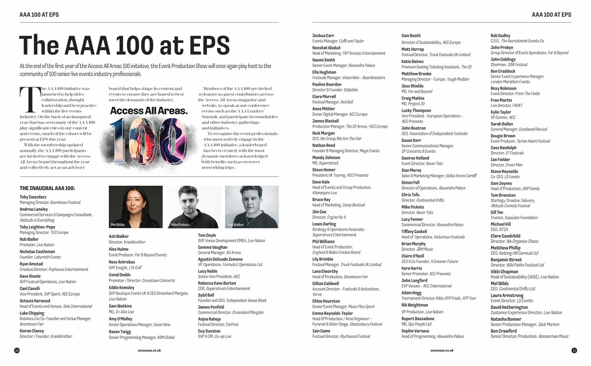 With the membership updated annually, the AAA 100 participants are invited to engage with the Access All Areas brand throughout the year and collectively act as an advisory board that helps shape its content and events to ensure they are honed to best meet the demands of the industry.
