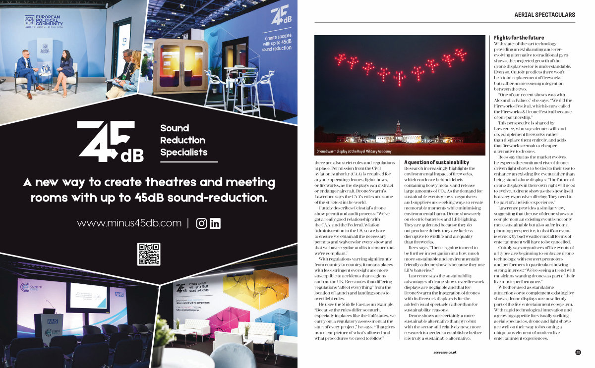 Rees say that as the market evolves, he expects the continued rise of dronedriven light shows to be tied to their use to enhance an existing live event rather than being stand-alone displays:“ The future of drone displays in their own right will need to evolve. A drone show as the show itself is a very expensive offering. They need to be part of a holistic experience.”