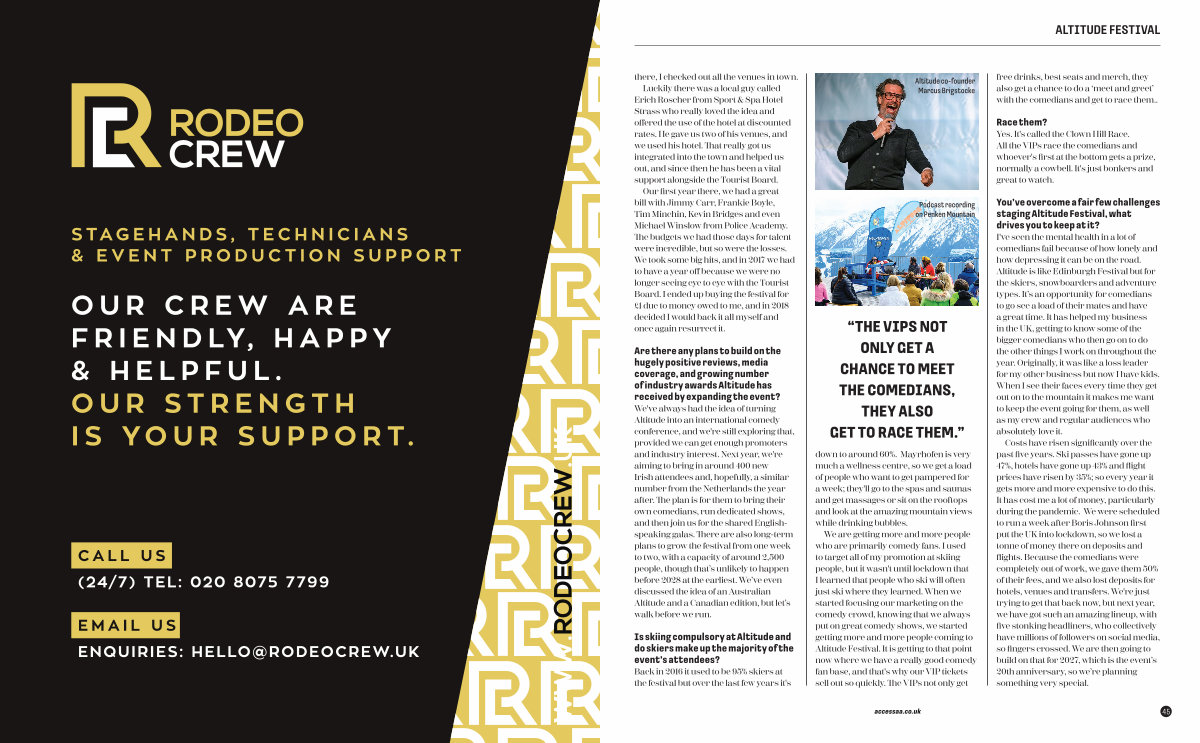 I ' ve seen the mental health in a lot of comedians fail because of how lonely and how depressing it can be on the road. Altitude is like Edinburgh Festival but for the skiers, snowboarders and adventure types. It’ s an opportunity for comedians to go see a load of their mates and have a great time. It has helped my business in the UK, getting to know some of the bigger comedians who then go on to do the other things I work on throughout the year. Originally, it was like a loss leader for my other business but now I have kids. When I see their faces every time they get out on to the mountain it makes me want to keep the event going for them, as well as my crew and regular audiences who absolutely love it.
