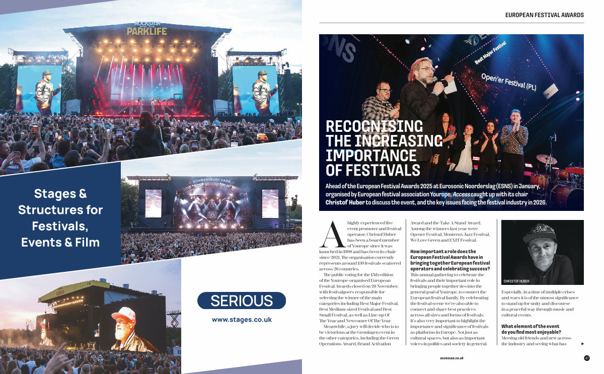 Ahead of the European Festival Awards 2025 at Eurosonic Noorderslag( ESNS) in January, organised by European festival association Yourope, Access caught up with its chair Christof Huber to discuss the event, and the key issues facing the festival industry in 2026.