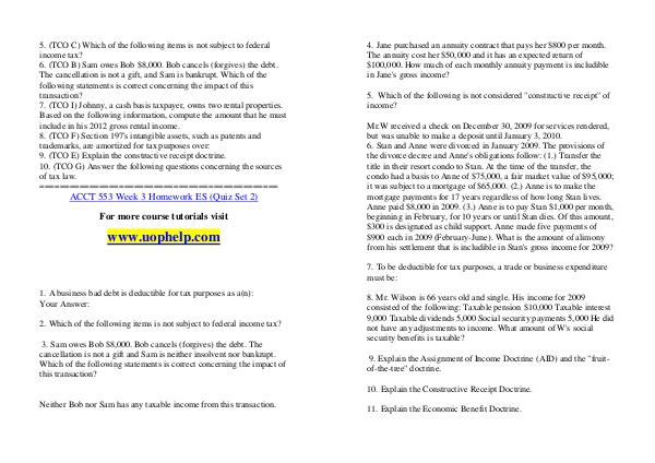 Mr. W received a check on December 30, 2009 for services rendered, but was unable to make a deposit until January 3, 2010. 6. Stan and Anne were divorced in January 2009. The provisions of the divorce decree and Anne ' s obligations follow:( 1.) Transfer the title in their resort condo to Stan. At the time of the transfer, the condo had a basis to Anne of $ 75,000, a fair market value of $ 95,000; it was subject to a mortgage of $ 65,000.( 2.) Anne is to make the mortgage payments for 17 years regardless of how long Stan lives. Anne paid $ 8,000 in 2009.( 3.) Anne is to pay Stan $ 1,000 per month, beginning in February, for 10 years or until Stan dies. Of this amount, $ 300 is designated as child support. Anne made five payments of $ 900 each in 2009( February-June). What is the amount of alimony from his settlement that is includible in Stan ' s gross income for 2009?