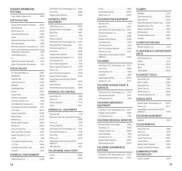 Aqueous Vets ...................... 7115 Blue-White ........................ 14097 ChlorTainer ( TGO Technologies , Inc .) . 10101 Flomotion Systems , Inc . ............. 4108 Force Flow ........................ 16086 Halogen Valve Systems ............. 16086 Ixom Watercare ..................... 9095 JCS Industries , Inc . ................. 9106 Saf-T-Flo Chemical Injection ......... 14108 Techwin Co ., Ltd . .................. 12101