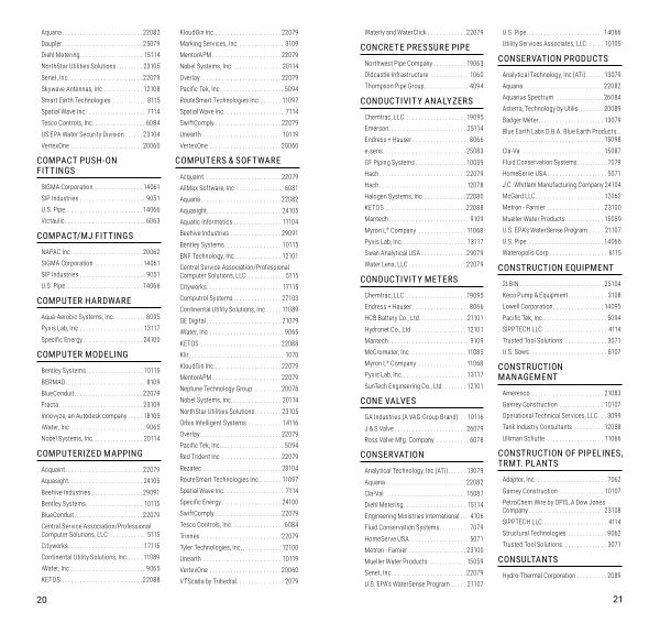 Cla-Val ........................... 15087 Fluid Conservation Systems .......... 7079 HomeServe USA .................... 5071 J . C . Whitlam Manufacturing Company 24104 McGard LLC ....................... 12062 Metron - Farnier ................... 23100 Mueller Water Products ............. 15059 U . S . EPA ’ s WaterSense Program ..... 21107 U . S . Pipe .......................... 14066 Wateropolis Corp ................... 6115
