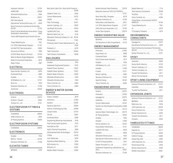 Texas A & M Engineering Extension Service ................................. 24106 Tripac Marketing Inc . ................ 7061 U . S . EPA ’ s WaterSense Program ..... 21107 Uni-Bell PVC Pipe Association ........ 8082 University of Illinois ................. 7084 US EPA Water Security Division . . . . . . 23104 Water & Wastes Digest Magazine .... 10095 Water Environment Federation ........ 4070 Water Online ....................... 7087