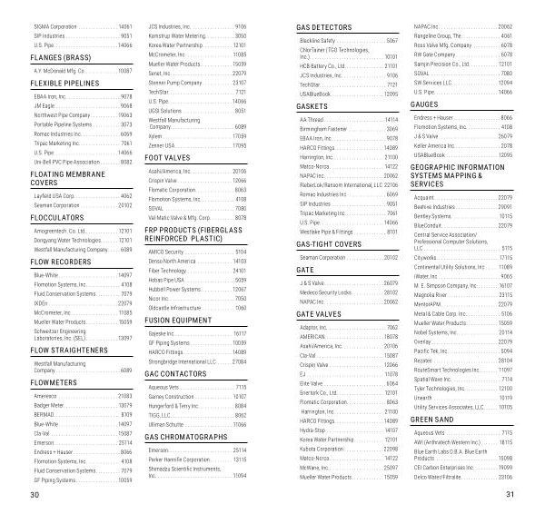 Ameresco ........................ 21083 Badger Meter ...................... 13079 BERMAD ........................... 8109 Blue-White ........................ 14097 Cla-Val ........................... 15087 Emerson .......................... 25114 Endress + Hauser ................... 8066 Flomotion Systems , Inc . ............. 4108 Fluid Conservation Systems .......... 7079 GF Piping Systems ................. 10059