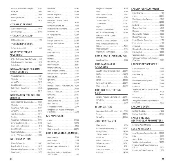 Flomotion Systems , Inc . ............. 4108 Fluid Conservation Systems .......... 7079 Fluidion US Inc ..................... 22079 GF Piping Systems ................. 10059 Graybar ............................ 7056 Halogen Systems , Inc .............. 22080 Halogen Valve Systems ............. 16086 Howden .......................... 11098 In-Situ ............................. 9086 Keller America Inc . .................. 2078 Lovibond .......................... 3095 Mantech ........................... 9109 McCrometer , Inc ................... 11085 Metrix Vibration .................... 6061 Myron L ® Company ................ 11068 Orbis Intelligent Systems ........... 14116 Parker Hannifin Corporation ......... 13115 Pyxis Lab , Inc ...................... 13117 rqmicro AG ........................ 22079 Senet , Inc ......................... 22079 Shimadzu Scientific Instruments , Inc .. 11094 Specific Energy .................... 24100 Swan Analytical USA ............... 29079 Syrinix Inc ........................ 20101 TechStar ........................... 7121 Tesco Controls , Inc . . . . . . . . . . . . . . . . . . 6084 VEGA Americas .................... 12121 VTScada by Trihedral ................ 2079