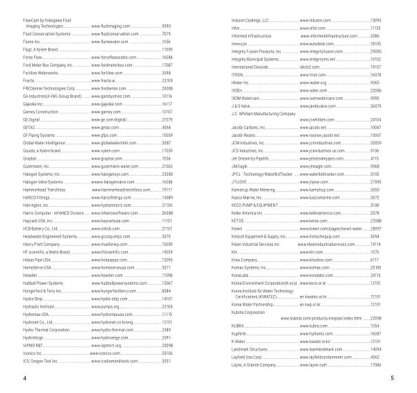 Fluid Conservation Systems ..................... www . fluidconservation . com ......................... 7079 Flume Inc ..................................................... www . flumewater . com ................................... 1056 Flygt , A Xylem Brand .................................. .................................................................... 17059 Force Flow ................................................... www . forceflowscales . com ........................... 16086 Ford Meter Box Company , Inc ................... www . fordmeterbox . com ............................... 17087 Fortiline Waterworks .................................. www . fortiline . com ......................................... 3098 Fracta .......................................................... www . fracta . ai ................................................. 23109 FREDsense Technologies Corp ................. www . fredsense . com ..................................... 26086 GA Industries ( A VAG-Group Brand ).......... www . gaindustries . com ................................. 10116 Gajeske Inc .................................................. www . gajeske . com ......................................... 16117 Garney Construction .................................. www . garney . com ........................................... 10107 GE Digital ..................................................... www . ge . com / digital /.................................... 21079 GETAC .......................................................... www . getac . com ............................................. 4064 GF Piping Systems ..................................... www . gfps . com ............................................... 10059 Global Water Intelligence ........................... www . globalwaterintel . com ........................... 5087 Goulds , a Xylem brand ............................... www . xylem . com ............................................ 17059 Graybar ........................................................ www . graybar . com .......................................... 7056 Gutermann , Inc ........................................... www . gutermann-water . com ......................... 21062 Halogen Systems , Inc ................................ www . halogensys . com ................................... 22080 Halogen Valve Systems ............................. wwww . halogenvalve . com ............................. 16086 Hammerhead Trenchless . www . hammerheadtrenchless . com ............. 19117 HARCO Fittings ........................................... www . harcofittings . com ................................ 14089 Harrington , Inc ............................................ www . hydrantstorz . com ................................ 21100 Harris Computer - inHANCE Division ........ www . inhancesoftware . com ......................... 26088 Haycarb USA , Inc ........................................ www . haycarbusa . com .................................. 11101 HCB Battery Co ., Ltd .................................www . cnhcb . com ............................................ 21101 Headwater Engineered Systems ............... www . giconpumps . com ................................. 5070 Henry Pratt Company ................................. www . muellerwp . com .................................... 15059 HF scientific , a Watts Brand ...................... www . hfscientific . com ................................... 19059 Hobas Pipe USA .......................................... www . hobaspipe . com .................................... 12090 HomeServe USA ......................................... www . homeserveusa . com ............................. 5071 Howden ....................................................... www . howden . com ......................................... 11098 Hubbell Power Systems . www . hubbellpowersystems . com ................. 12067 Hungerford & Terry Inc ............................... www . hungerfordterry . com ........................... 8084 Hydra-Stop .................................................. www . hydra-stop . com .................................... 14107 Hydraulic Institute ...................................... www . pumps . org ............................................ 22105 Hydromax USA ........................................... www . hydromaxusa . com ............................... 11115 Hydronet Co ., Ltd ........................................ www . hydronet . co . kr / eng .............................. 12101 Hydro-Thermal Corporation ...................... www . hydro-thermal . com .............................. 2089 HydroVerge ................................................. www . hydroverge . com ................................... 2091 IAPMO R & T .................................................. www . iapmort . org ........................................... 20098 Iconics Inc .................................................. w ww . iconics . com ............................................ 25106 ICS , Oregon Tool Inc ................................... www . icsdiamondtools . com .......................... 5051