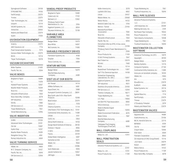 Analytical Technology , Inc ( ATi ) ...... 13079 Aquasight ......................... 24105 Badger Meter ...................... 13079 Bentley Systems ................... 10115 Computrol Systems ................ 27103 Continental Utility Solutions , Inc ...... 11089 Innovyze , an Autodesk company . . . . . 18105 iWater , Inc ......................... 9065 Klir ................................ 1070 KloudGin Inc ....................... 22079 NJBSoft ........................... 4068 Nobel Systems , Inc . ................ 20114 s :: can ............................ 13079 Spatial Wave Inc . ................... 7114 SwiftComply ...................... 22079 Trinnex . . . . . . . . . . . . . . . . . . . . . . . . . . . 22079 VTScada by Trihedral ................ 2079 Waterly and WaterClick . . . . . . . . . . . . . 22079
