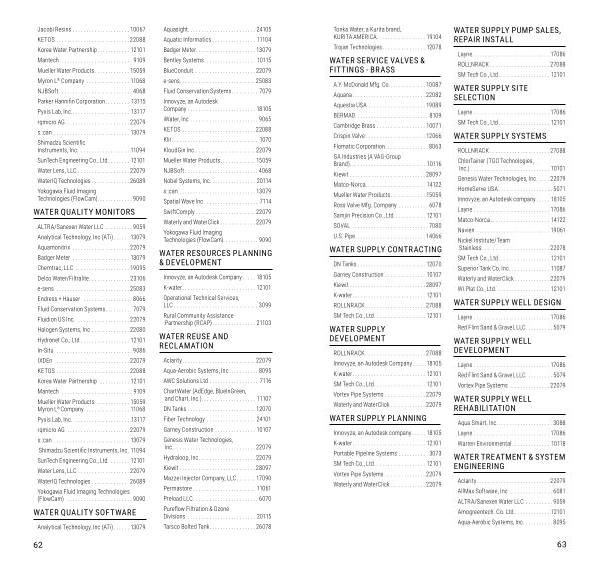 Aquasight ......................... 24105 Aquatic Informatics . . . . . . . . . . . . . . . . 11104 Badger Meter ...................... 13079 Bentley Systems ................... 10115 BlueConduit ....................... 22079 e-sens ............................ 25083 Fluid Conservation Systems .......... 7079