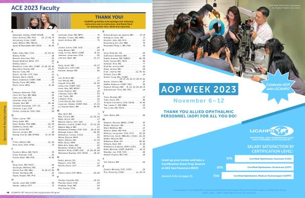 Campos , Adrienne , COA ................ 26 Chan , R . V . Paul , MD , MBA ............... 28 Chen , John , MD , PhD ...................... 24 Cheshier , Holly , COT . . . . . . . . . . . . . . . . . . . 41 Choplin , Neil , MD .................. 25 , 40 Christoff , Alexander , COT , CO ........... 24 Cisneros , Lupe , COA . ................. 25 Cortez , Leobardo , COA , CRA ........... 25