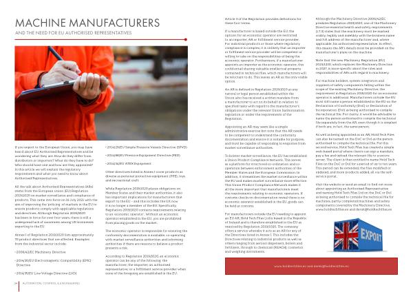 Note that the new Machinery Regulation( EU) 2023 / 1230, which replaces the Machinery Directive in 2027, is more specific about the roles and responsibilities of ARs with regard to machinery.