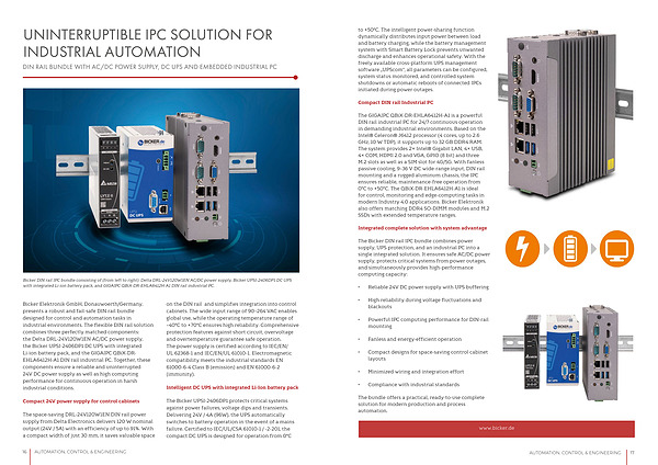 Bicker Elektronik GmbH, Donauwoerth / Germany, presents a robust and fail-safe DIN rail bundle designed for control and automation tasks in industrial environments. The flexible DIN rail solution combines three perfectly matched components: the Delta DRL-24V120W1EN AC / DC power supply, the Bicker UPSI-2406DP1 DC UPS with integrated Li-ion battery pack, and the GIGAIPC QBiX-DR- EHLA6412H-A1 DIN rail industrial PC. Together, these components ensure a reliable and uninterrupted 24V DC power supply as well as high computing performance for continuous operation in harsh industrial conditions.