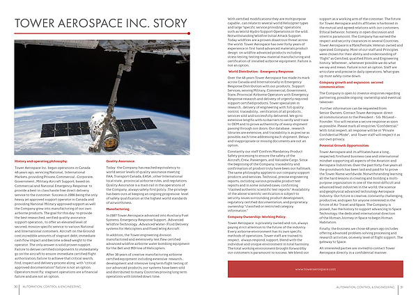 In 1987 Tower Aerospace advanced into Auxiliary Fuel Systems, Emergency Response Support, Advanced Wildfire Technology, Advanced Water- Fluid Delivery systems for Helicopters and Fixed Wing Aircraft.