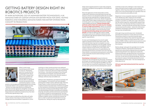 BY MARK RUTHERFORD, CEO OF ALEXANDER BATTERY TECHNOLOGIES, A UK MANUFACTURER OF CUSTOM LITHIUM-ION BATTERY PACKS FOR OEMS. HELPING ROBOTICS AND INDUSTRIAL MANUFACTURERS TAKE BATTERY SYSTEMS FROM CONCEPT TO PRODUCTION
