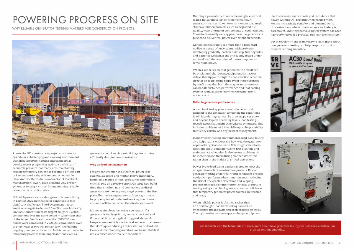 Across the UK, construction projects continue to operate in a challenging and evolving environment, with infrastructure, housing and commercial developments progressing against a backdrop of economic pressure. For many sites, maintaining reliable temporary power has become a critical part of keeping work safe, efficient and on schedule. Here, Andrew Keith, division director of load bank manufacturer Power Prove, explains why proper generator testing is critical for maintaining reliable power on construction sites.