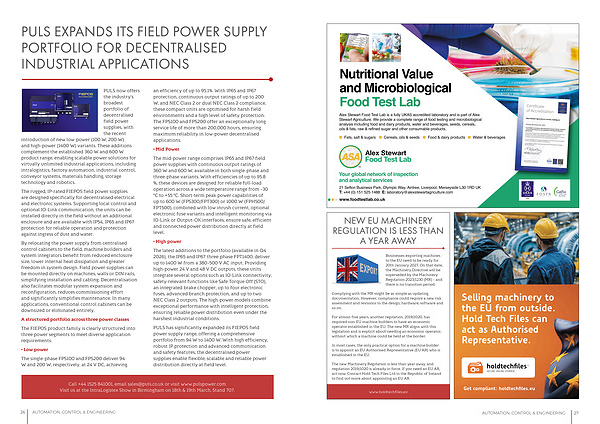 PULS now offers the industry’ s broadest portfolio of decentralised field power supplies, with the recent introduction of new low-power( 100 W, 200 W) and high-power( 1400 W) variants. These additions complement the established 360 W and 600 W product range, enabling scalable power solutions for virtually unlimited industrial applications, including intralogistics, factory automation, industrial control, conveyor systems, materials handling, storage technology and robotics.