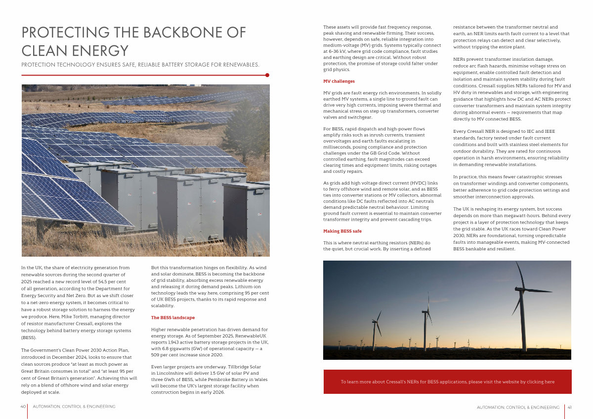 In the UK, the share of electricity generation from renewable sources during the second quarter of 2025 reached a new record level of 54.5 per cent of all generation, according to the Department for Energy Security and Net Zero. But as we shift closer to a net-zero energy system, it becomes critical to have a robust storage solution to harness the energy we produce. Here, Mike Torbitt, managing director of resistor manufacturer Cressall, explores the technology behind battery energy storage systems( BESS).